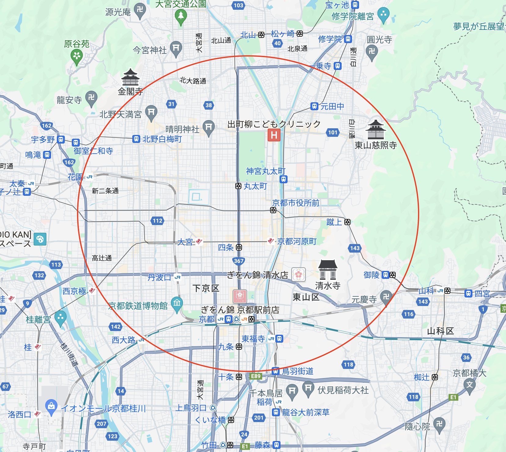 主に京都市 北区・左京区・上京区・中京区・下京区・東山区なりますが、京都市営地下鉄 烏丸線 烏丸御池駅より半径約16km圏内であればお伺いすることも可能ですので、お気軽にご相談ください。(赤丸のエリアで半径4~5kmです)